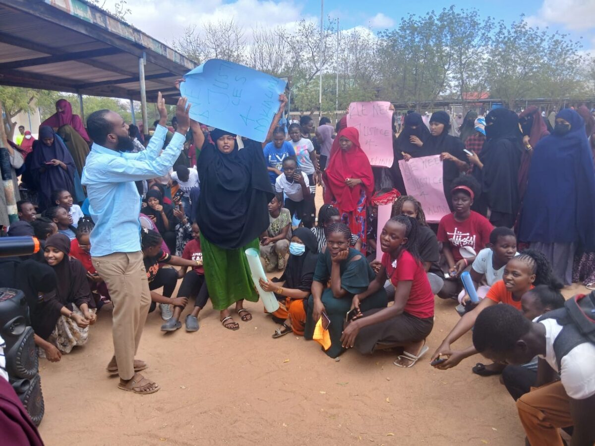 Garissa Teachera training college protesting following the killing of their Tutor Hillary Ochieng on Saturday, they have called for immediate arrest of criminals behind his tragic death. Photo/Abdimalik Hajir.