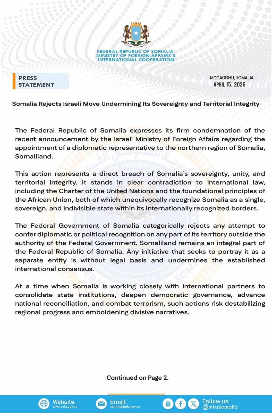 “Somaliland remains an integral part of the Federal Republic of Somalia,” the ministry said. “Any initiative that seeks to portray it as a separate entity is without legal basis.”