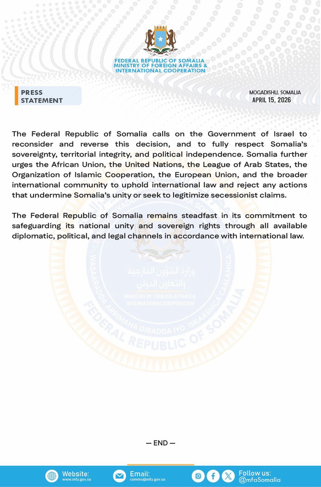 Mogadishu reaffirmed its commitment to defending its sovereignty “through all available diplomatic, political, and legal channels in accordance with international law.”